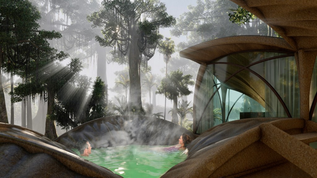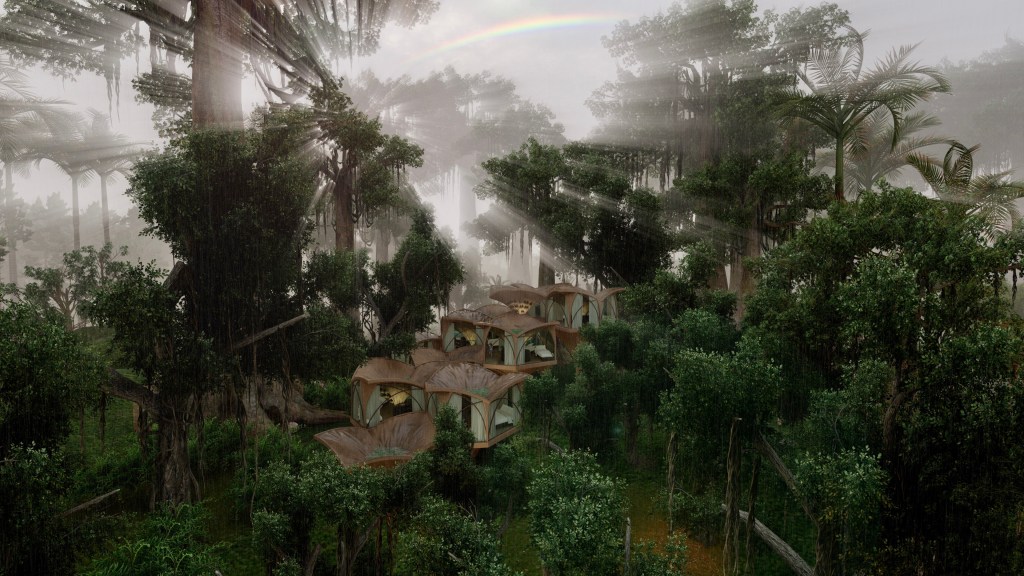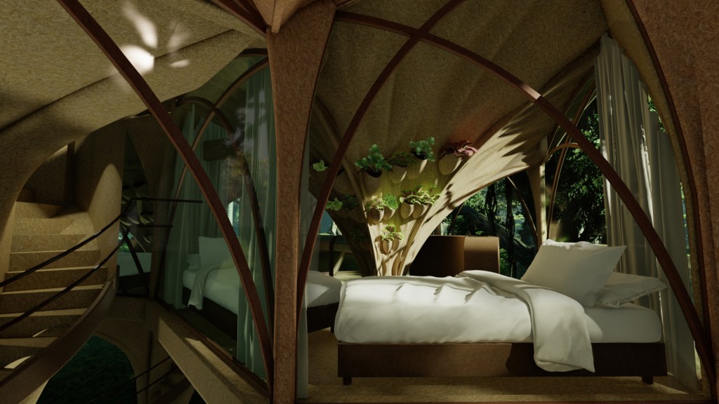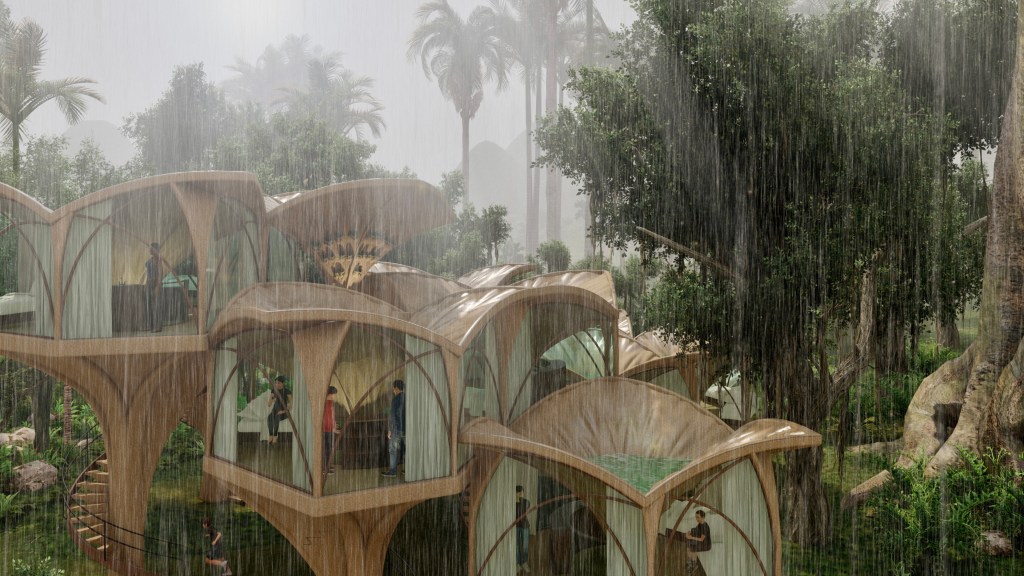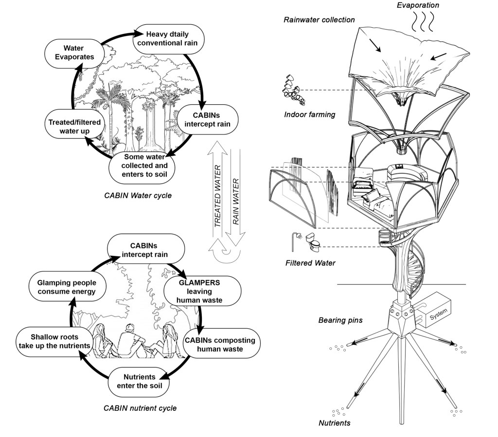 Located in a rainforest, one of the world’s wettest ecosystems, the Glamping CABINs have to adapt to the main characteristics of tropical rainforest biome: very high annual rainfall, high average temperatures, nutrient-poor soil, and high levels of biodiversity.Shaped like a “pin”, these Glamping CABINs are to minimize ecological impact by reducing the footprint, made possible by its pin foundation which doesn’t require much excavation. Being a temporary construction, it’s prefab design to be transported by helicopter containers and installed on site. Materials consists of eco-friendly OSB boards that resist rain water, and biodegradable plastic panels for panoramic view windows.Each Glamping CABIN has a floor area of 27 m2: mini kitchen counter, sleeping area and a semi-outdoor bathroom. By learning from the “layers” of the rainforest, multiple cascading Glamping CABINs together form a complex consisted of “the upper canopy” for rainwater collection, the residence area, and the communal area under canopies on the forest floor. By integrating rainwater harvesting system and the human waste composting technology, the Glamping CABINs becomes a “mini-rainforest”.