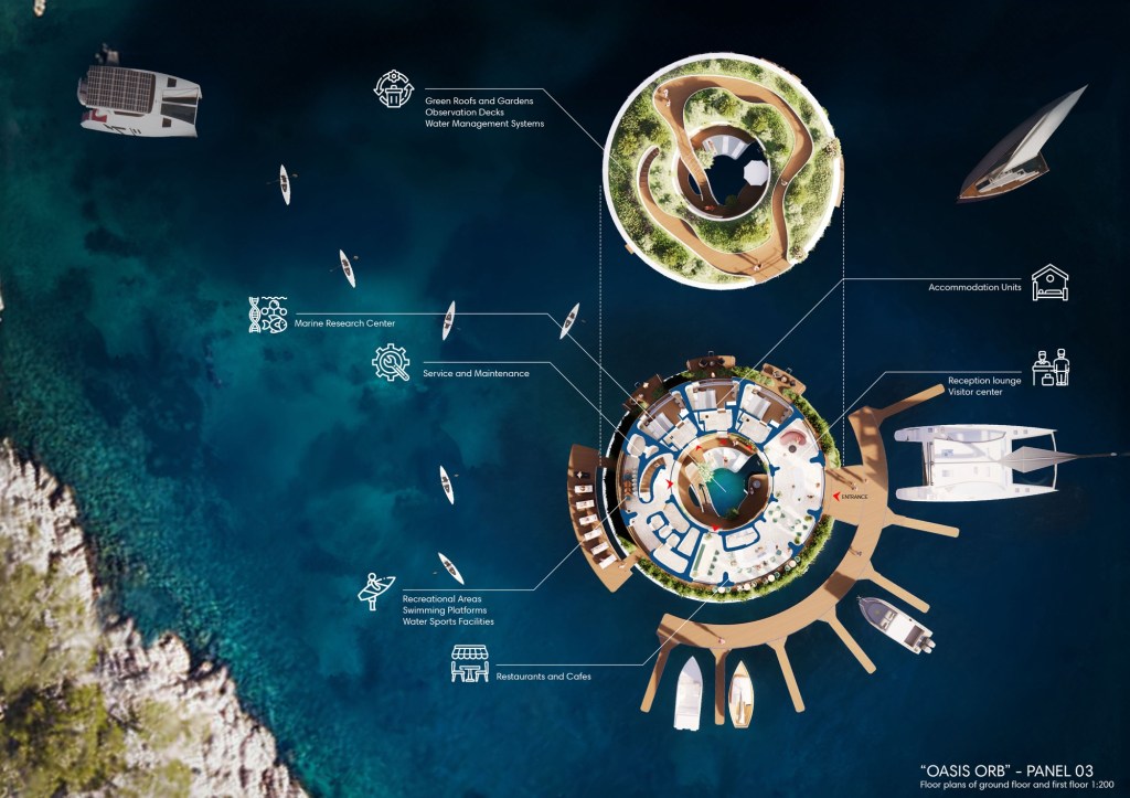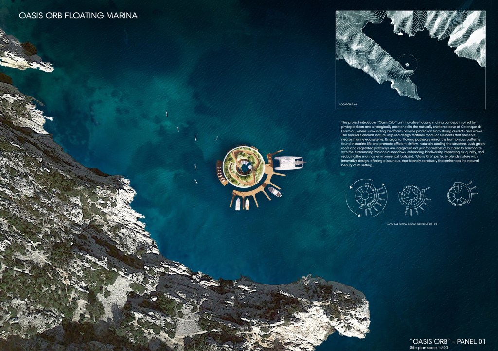 This project introduces “Oasis Orb,” an innovative floating marina concept inspired by