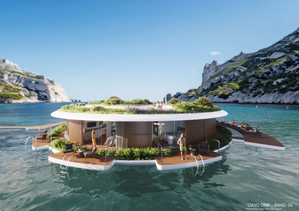 harmonize with the surrounding Posidonia meadows, enhancing biodiversity, improving air quality, and reducing the marina’s environmental footprint. “Oasis Orb” perfectly blends nature with innovative design, offering a luxurious, eco-friendly sanctuary that enhances
